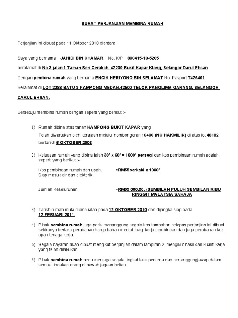 Nama penyewa Nombor telefon Peranan dan tanggungjawab kedua belah pihak. Perjanjian Pengikatan Jual Beli Konsumen dengan Developer 4. Surat persetujuan pengubahsuaian rumah surat ini diakui sah diantara pemilik rumah dan kontraktor syafiqq constructions engineering works nopendaftaran sa8224552 yang apabila turunnya tandatangan kedua pihak dan tandatangan seorang saksi dan dipanjangkan kepada.